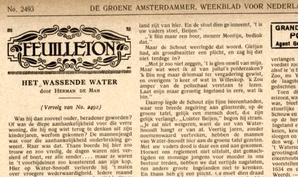 "In Hoenkoop, achter den IJsselstroom, daar ligt een zware kruishoef met breede lage stalling, twee vijfroei's hooibergen, zomerhuis en open wagenschuur, te midden van het vette land. Water-Snoodt is die woning geheeten. Dat is het onbezwaard bezit van de oude vrouw Beijen, de weeuw van Rijk Beijen verscheiden, die al zijn baasjaren Hoofdingeland, later Heemraad van de Vereenigde Waterschappen is geweest." ![]() Zo begint Het wassende water, het bekendste boek van de schrijver Herman de Man. De hoofdpersoon van het boek is Gieljan Beijen, de tweede zoon van de weduwe Beijen. In zijn jonge jaren heeft hij een hevig maar onderdrukt conflict met zijn trotse moeder over de keuze van een huwelijkspartner, maar na lange tijd verzoenen beiden zich. Gieljan brengt het, eigenlijk ongewild, tot plaatsvervangend dijkgraaf van het Hoogheemraadschap van den Lekdijk Benedendams. In die functie speelt hij een belangrijke rol in een winter waarin de rivierdijken dreigen te bezwijken. Ondanks veel verzet weet hij gedaan te krijgen dat de Lopikerwaard deels onder water wordt gezet om nog ernstiger schade elders te voorkomen. Zijn worsteling met het christelijke, in zijn geval streng-calvinistische, geloof is een belangrijk element in het boek. Geen waar gebeurde verhalenVeel mensen hebben het boek gelezen of de tv-bewerking gezien, en vragen zich af in hoeverre het verhaal berust op historische gegevens en hoe het zit met de Beijens uit het boek.Die Beijens hebben nooit bestaan, althans niet zoals ze in het boek worden beschreven. Herman de Man schreef geen geschiedenisboeken maar romans. Daarbij combineerde hij allerlei mensen die hij had leren kennen en dingen die hij had horen vertellen tijdens zijn tochten door de Lopikerwaard en omgeving, de streek waar hij was opgegroeid. Over Herman de Mans aanpak schreef Henk Povée, een van de mensen die zich grondig in hem hebben verdiept: "hij beschreef bijvoorbeeld een schandaaltje rond de rijkste boer van Benschop, gaf hem de naam van de rijkste boer in Polsbroek mee en situeerde zijn verhaal dan een paar kilometer verderop in Hoenkoop. In de praktijk een dusdanig spaarzame verhulling dat verschillende streekbewoners weinig plezierig werden getroffen door hun eigen verheffing tot romanheld of -heldin." Ook Het wassende water was geen getrouwe weergave van feiten. In Hoenkoop hebben nooit Beijens gewoond; in naburige plaatsen als Benschop, Polsbroek en Lopik woonden daarentegen veel leden van de tak Jan Thomas van de IJsselsteinse familie. In de tijd van Herman de Man kwamen in de familie Beijen de voornamen Gieljan en Rijk niet voor. Jaren later, in 1971, werd er alsnog een Gieljan Beijen geboren, en in 1990 een Rijk Willem Beijen. Er is in Hoenkoop (bij Oudewater) wel een boerderij 'Water-Snood' (klik op de foto voor een vergroting, afkomstig van Streetview), maar die staat langs de weg en niet, zoals in het boek, midden in het land. En nog een opvallend punt: de Lopikerwaard heeft sinds 1751 niet meer onder water gestaan, terwijl het boek rond 1900 speelt. Van Joods jongetje tot katholieke schrijverHerman de Man werd in 1898 in Woerden geboren uit Joodse ouders. Zijn geboortenaam was Salomon Herman Hamburger; zijn roepnaam was Sal. Na een aantal jaren in Woerden woonde het gezin Hamburger in Polsbroekerdam, Benschop, Oudewater en Gouda. Sal ging op 13-jarige leeftijd na één jaar MULO van school. Vader Hamburger was handelaar in manufacturen en Sal liep, soms samen met zijn vader, de boerderijen in de Lopikerwaard langs met een kruiwagen met textiel en andere koopwaar, waaronder molle- en kattevellen. Zo leerde hij de streek, de mensen en de calvinistische opvattingen van velen van hen goed kennen. Hij hoorde en onthield de verhalen, hij hield van de streek, maar hij dacht het zijne over de mensen en hun opvattingen.![]() Zijn weigering om in militaire dienst te gaan leverde hem een jaar gevangenisstraf op. Kort daarna werd hij veroordeeld voor fraude en vluchtte hij tijdelijk naar België. Daar vond hij journalistiek werk en hij schreef er verhalen. In Brussel gebruikte hij voor het eerst het pseudoniem Herman de Man.