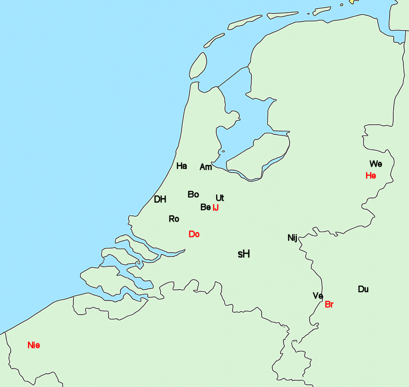 Am: Amsterdam, Be: Benschop, Bo: Bodegraven, Br: Breyell, DH: Den Haag, Do: Dordrecht, Du: Duisburg, Ha: Haarlem, He: Hengelo, IJ:IJsselstein, Nie: Nieuwkapelle, Nij: Nijmegen, Ro: Rotterdam, sH: 's-Hertogenbosch, Ut: Utrecht, Ve: Venlo, We: Weerselo.